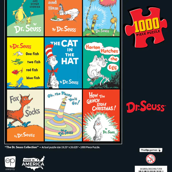 Instantly relive memories of childhood stories as you assemble this nostalgic 1,000-piece “Dr. Seuss Collection” jigsaw puzzle, featuring nine iconic covers of titles by the prolific author, including “Green Eggs and Ham”, “The Lorax”, “The Cat in the Hat”, and more in a 19x27” grid.
