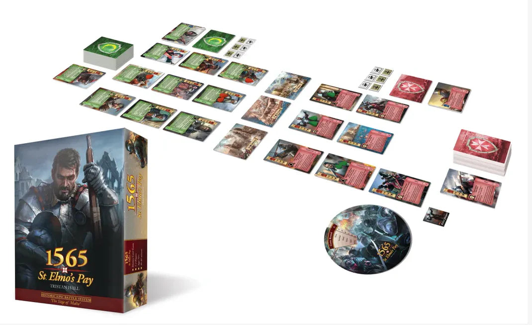 1565, St. Elmo's Pay is an asymmetric, competitive, tactical card game, and successor to the award-winning 1066, Tears to Many Mothers (also available in this campaign), with which it is fully compatible. Each player, as either Ottoman Turks or Knights of St John, musters troops and resources to overcome the various obstacles in their path before the two armies clash in an epic siege over three frontiers on the tiny island of Malta: Birgu, Senglea, and the doomed fortress of Saint Elmo.