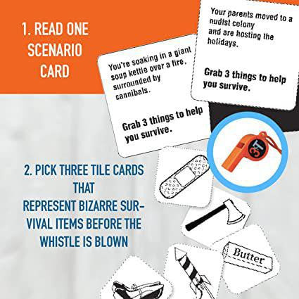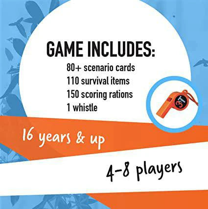 - INCLUDES: 80+ scenario cards, 110 survival items, 150 scoring rations and one whistle for dire situations.
