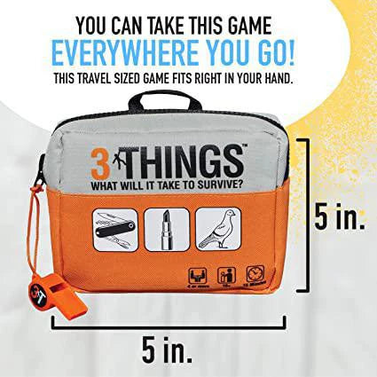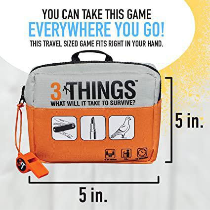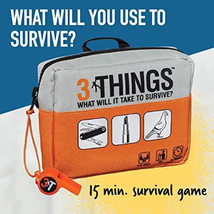 3 Things is the adult party game of do-or-die where savvy survivors must think quickly and select odd objects to help them live through unfortunate and outlandish survival scenarios. In 3 Things, the ultimate survival tool is your wits!