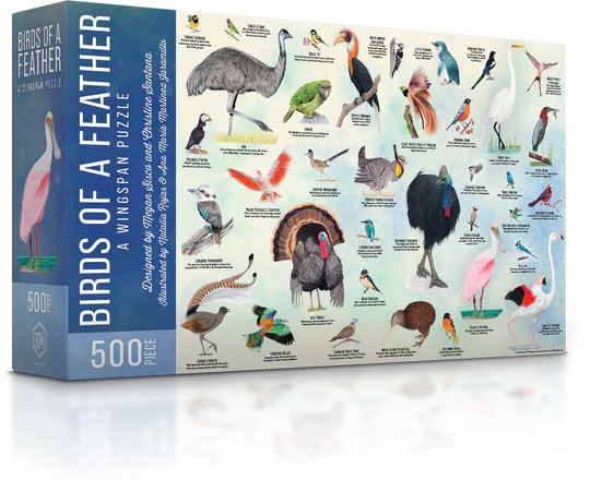 Birds of a Feather is a beginner-level 500-piece jigsaw puzzle designed specifically for Wingspan by Megan Sisco and Christine Santana, with a completed size of 54cm (wide) by 38cm (high).