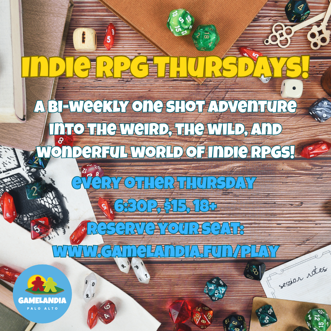 Calling all RPG enthusiasts! Whether you’re a seasoned veteran or interested in the world of Indie RPGS, Thursday night at Gamelandia is the perfect place for you. Join us in exploring a wide variety of Indie RPGs from high fantasy to sci-fi tactical adventures!