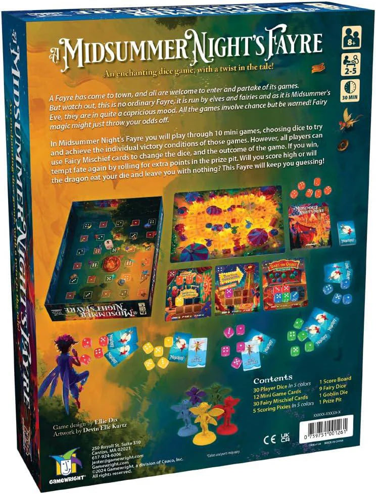 Play 10 mini games, choosing dice to try and achieve the individual victor conditions of those games. Use Fairy Mischief cards to change the dice, and the outcome of the game!