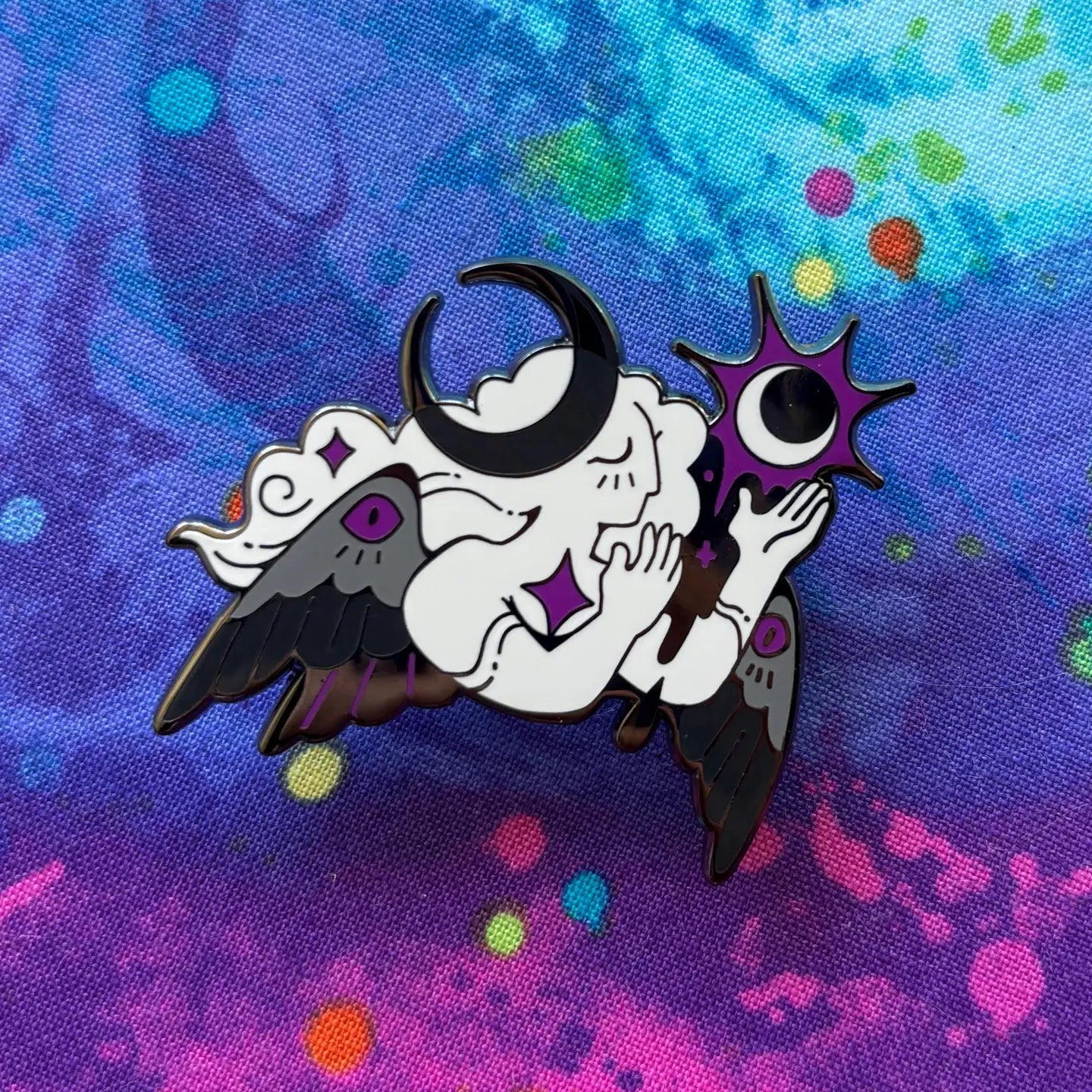 This pin is 1.9 inches wide with black nickel plating. It has hard enamel, two pin posts, and rubber backings.