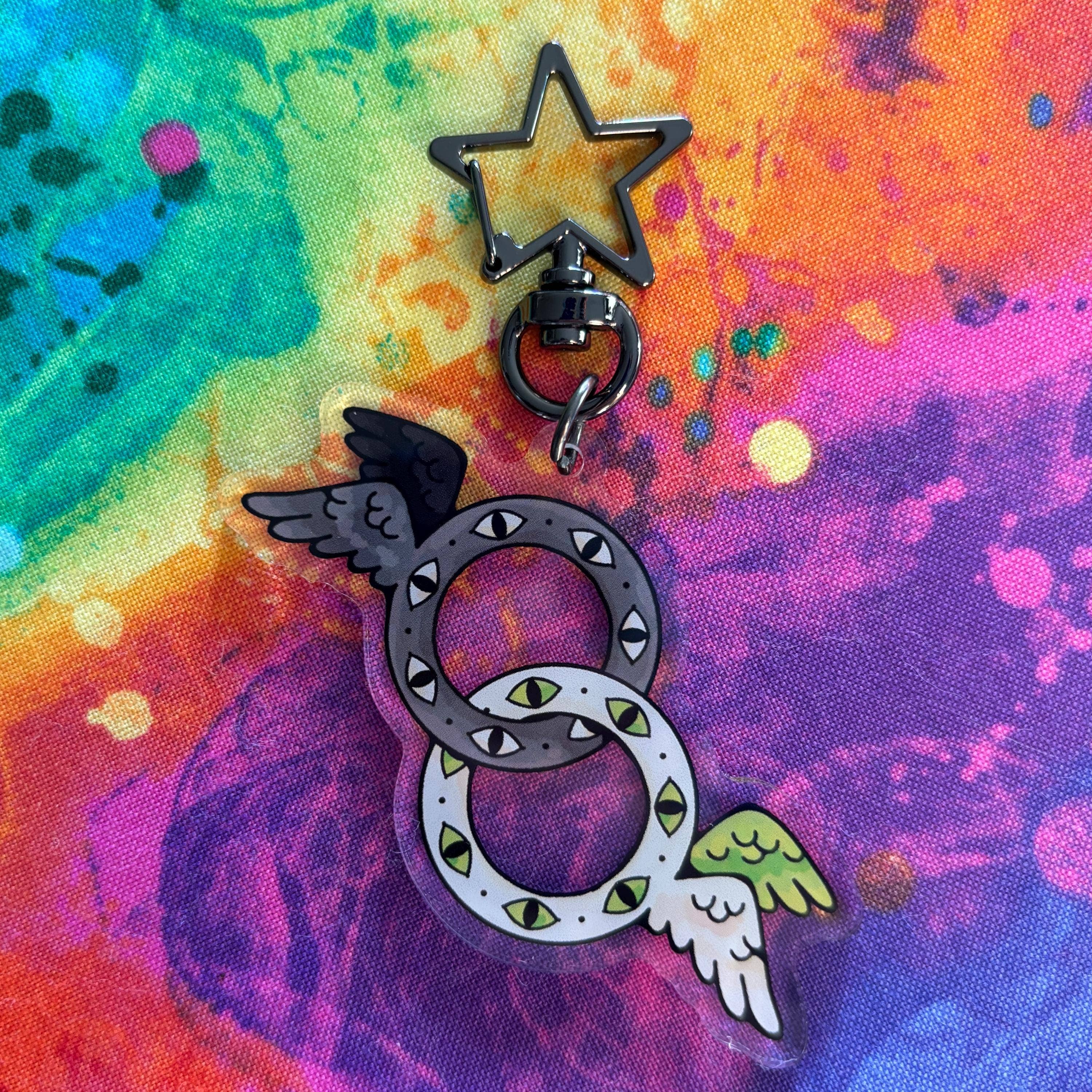 This acrylic keychain is 2.5 inches (6.3 cm) on the longest side, double-sided with the same print on both sides; it has a gun metal star clasp.