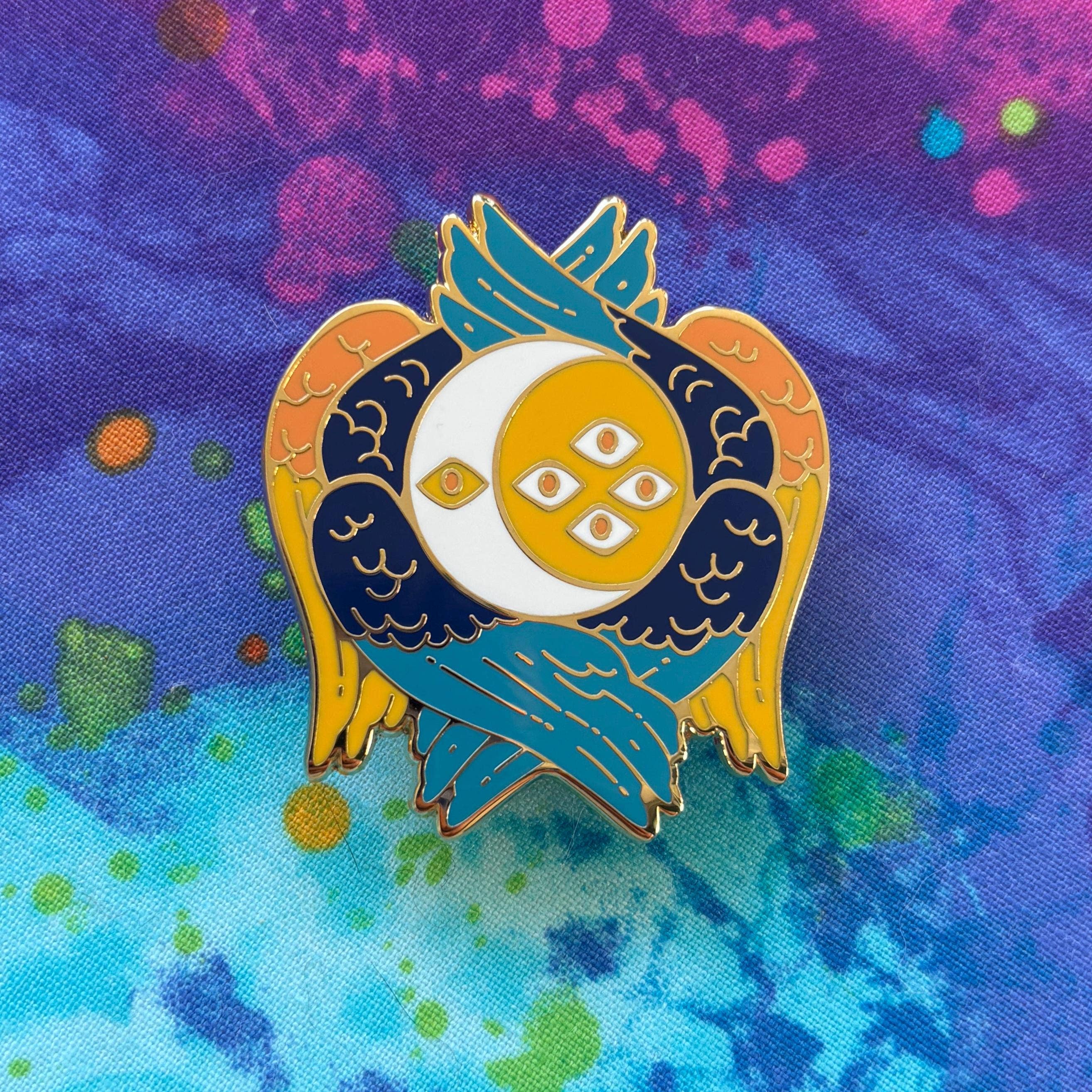 This pin is 1.8 inches long with gold plating. It has hard enamel, two pin posts, and rubber backings.