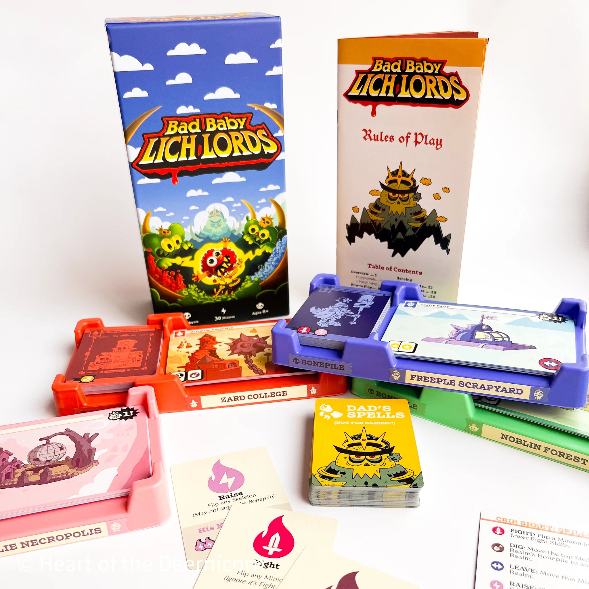 Lich siblings battle it out in this competitive card game inspired by your favorite Saturday morning cartoons. Flip double-sided skeleton cards to raise the dead and activate their powers. Cast dark spells. Wrangle your unruly minions and set off chain reactions and combos. Collect sets of minion cards to meet the requirements to score on realms. Be the first player to make enough noise to wake up the sleeping Lich King!