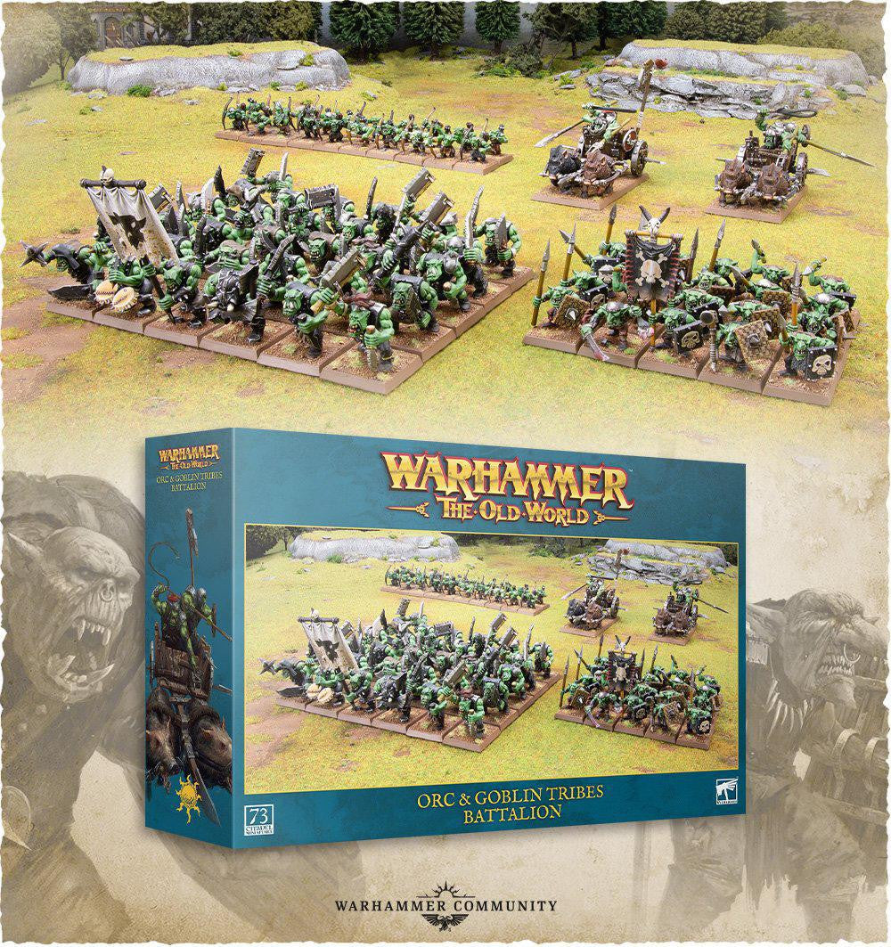 The Orc and Goblin Tribes are launching with a massive battalion box alongside an Arcane Journal. The former contains 73 plastic miniatures – two Orc Boar Chariots, 31 Orc Boyz (including a champion, a musician, and a standard bearer), and 40 Goblins with command upgrades of their own.