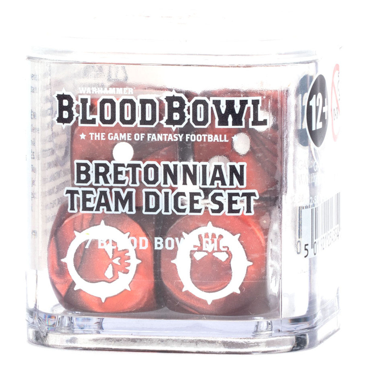 Show your support for your team of choice with a pack or two of themed Blood Bowl dice. This pack contains seven dice – three 6-sided Block dice, two regular 6-sided dice, one 8-sided Scatter dice, and one 16-sided dice – with Bretonnian teams getting rich red swirl-effect dice with white pips and the team logo on the six face.