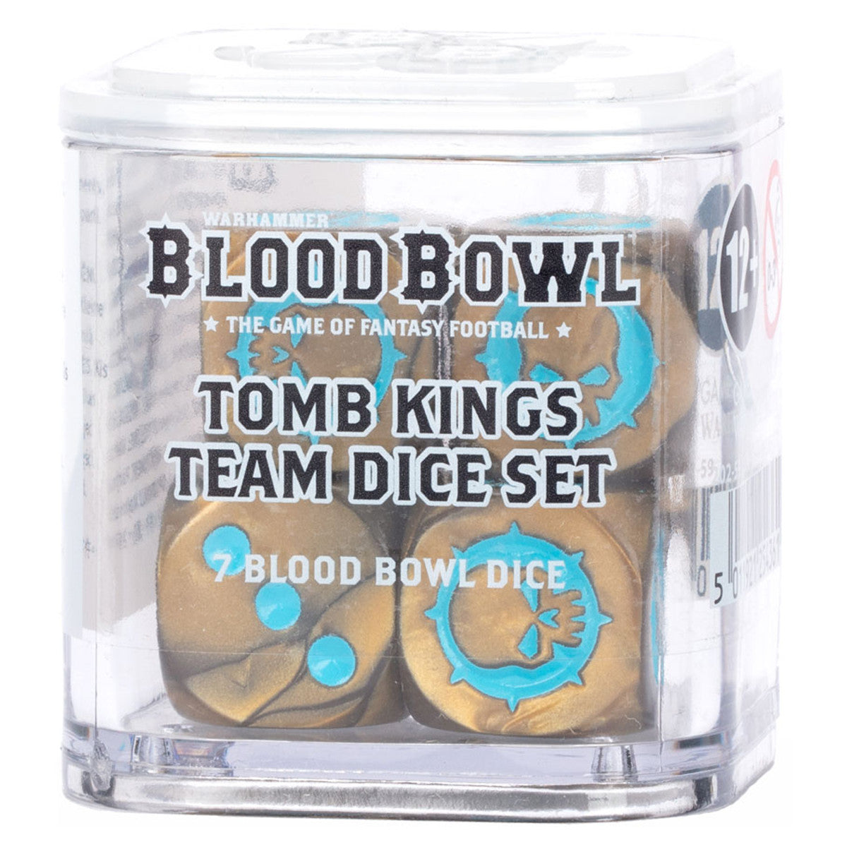 Show your support for your team of choice with a pack or two of themed Blood Bowl dice. This pack contains seven dice – three 6-sided Block dice, two regular 6-sided dice, one 8-sided Scatter dice, and one 16-sided dice – with Tomb Kings sporting gold and brown swirled dice with turquoise pips and their own icon on the six.
