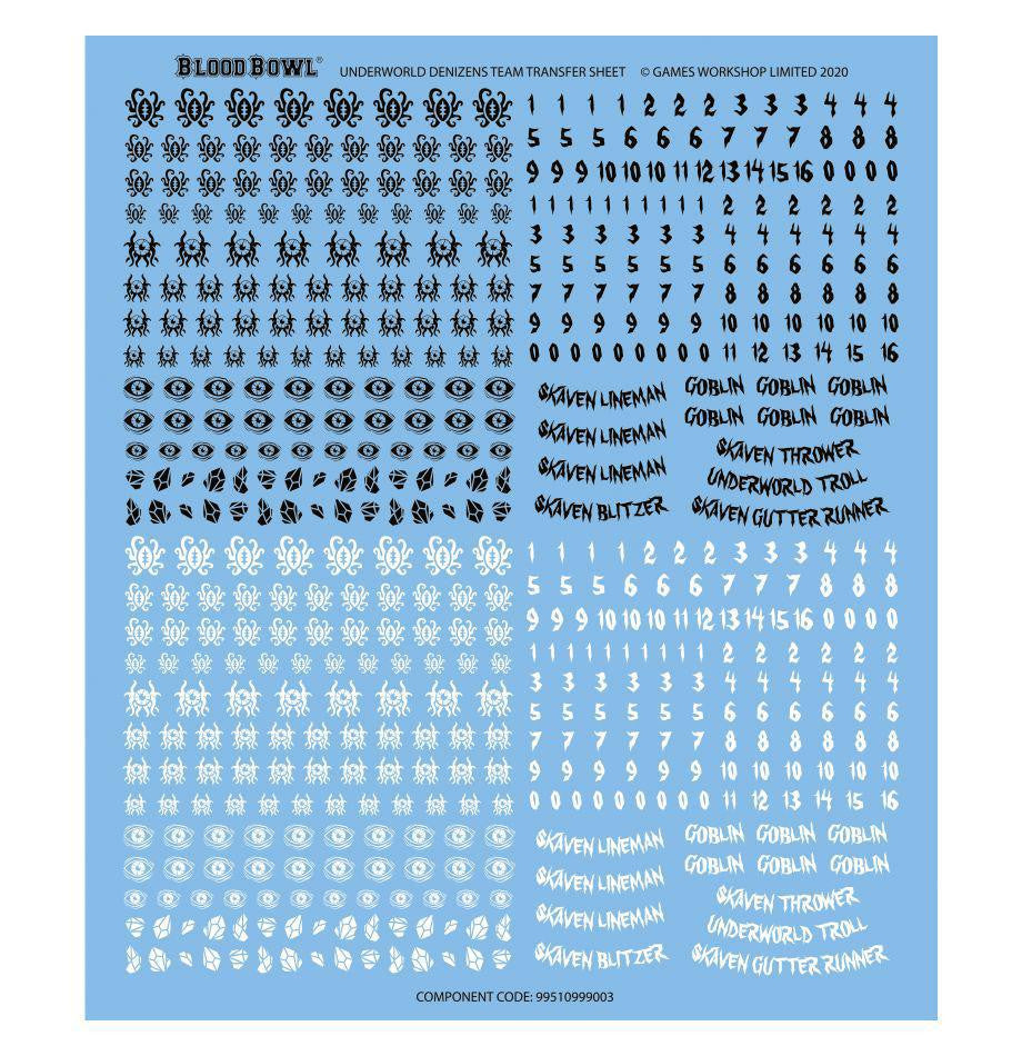 This multipart plastic kit builds an Underworld Denizens team of 12 players for games of Blood Bowl. Using components from the existing Goblin and Skaven team sets, you'll be able to build 6 Goblin Linemen, 3 Skaven Clanrats, 1 Skaven Blitzer, 1 Skaven Thrower, and 1 Skaven Gutter Runner. Some of these players include cosmetic options such as different heads to help you customise your own team. The box also includes six balls, two double-sided Blood Bowl coins, and two turn markers – split evenly between Skaven and Goblin designs – and a sheet of Underworld Denizens transfers with team logos, numbers, and positionals.
