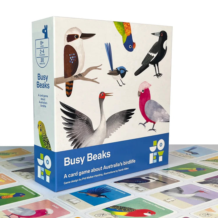 Get to know Australia’s most fascinating birds in this colourful card game. Each player collects bird cards and gathers them into flocks to score points. Whoever makes the most valuable flocks wins! Each bird also has a special ability - like the Powerful Owl who lets you search the deck for the card you really need, or the mimicking Magpie who lets you copy another card. Choose which birds you want to use each game to make every play feel different. Busy Beaks is a winner of The Dice Tower Seal of Excellence.