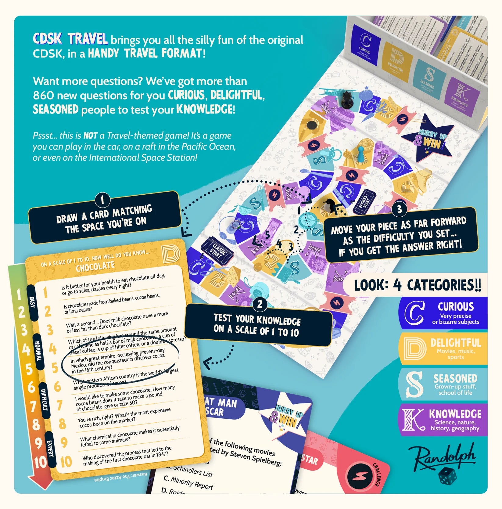 CDSK (Curious Delightful Seasoned Knowledge) is a trivia game that asks you to be honest with yourselves. How well do you know this subject? Too confident? You won't go anywhere. Too careful? You'll be crawling. But if you answer just right... you'll zoom off to glorious victory!
