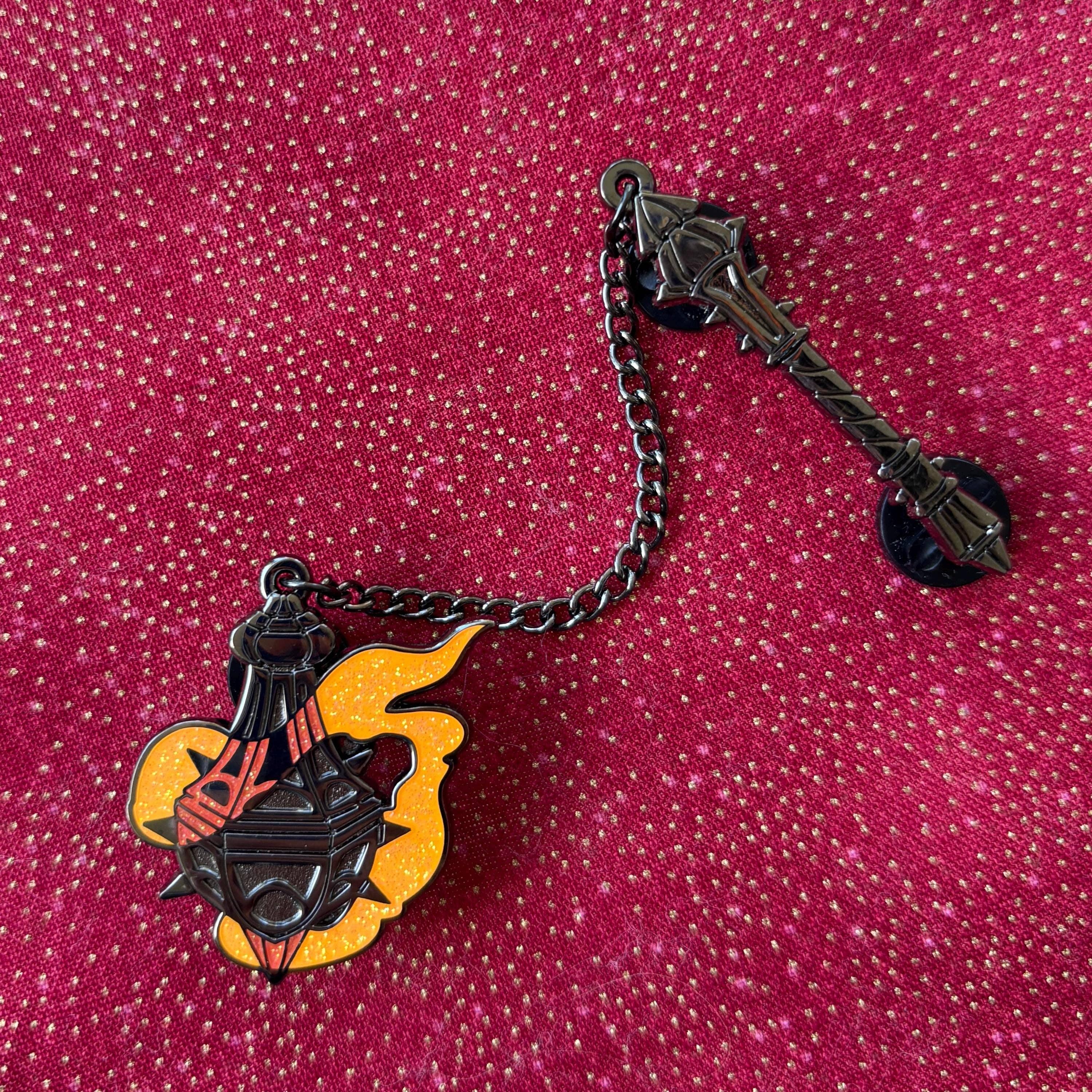 Censer Flail consists of two parts connected by a 2 in (5 cm) chain. It has black nickel plating, recessed metal details, and glitter enamel. The hilt is 1.6 inches (4 cm) long, while the censer is 1.2 (3 cm) inches long. Each component has two pin posts, hard enamel and rubber backings.