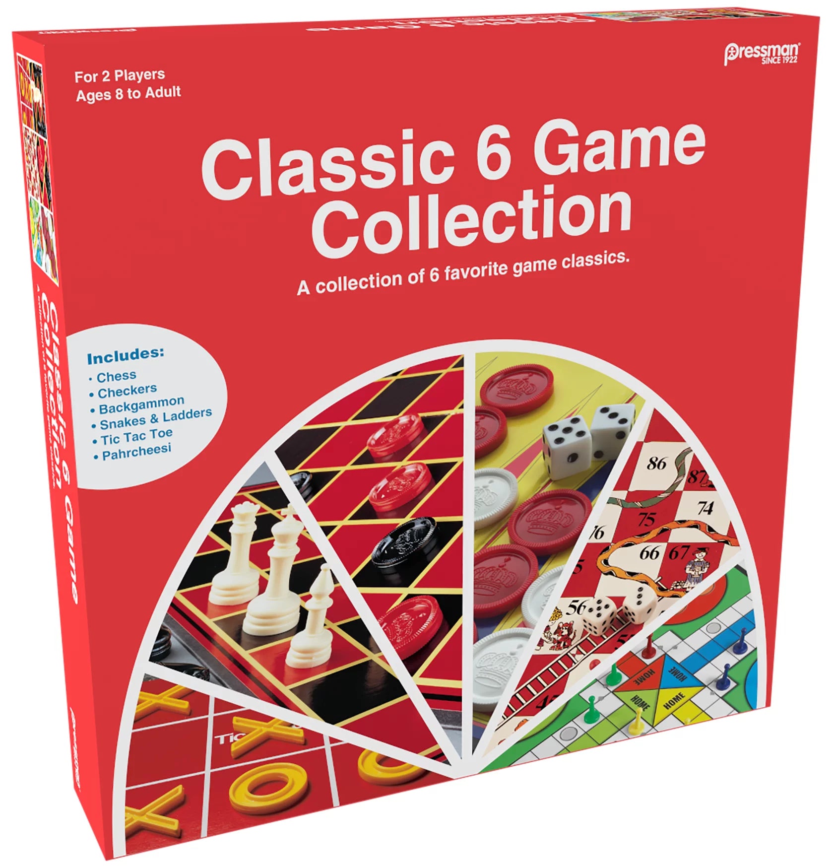 Add to your family game collection today with this perfect 6 game assortment from Pressman. This convenient all-in-one set features iconic favorites including Chess, Checkers, Backgammon, Tic-Tac-Toe, Snakes & Ladders, and Pahrcheesi. Enjoy high-quality plastic components, including interlocking Checker pieces, full-sized Staunton Chess pieces, and much more for endless classic fun. For 2 or more players, ages 8 and up.