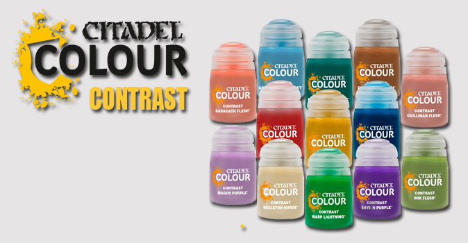 Citadel Contrast Paints by Games Workshop are a specially formulated, revolutionary acrylic paint. Contrast paints are designed to base, shade, and highlight your models all in a single application, drastically cutting down the time you spend painting your armies. Simply apply one layer over a light contrast undercoat and you will have a vivid base and realistic shading. All Citadel paints are non-toxic, water-based acrylic that are designed for use on plastic, metal, and resin miniatures. 18 ml of each color.