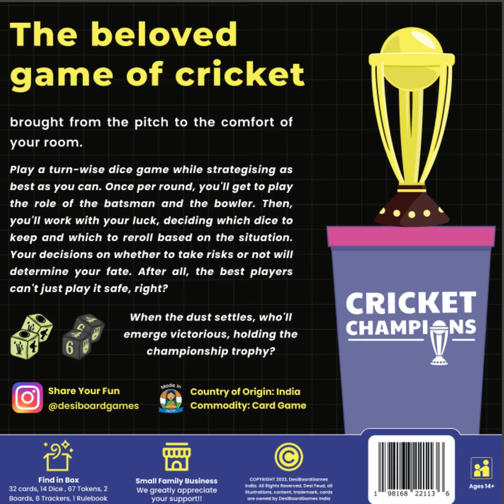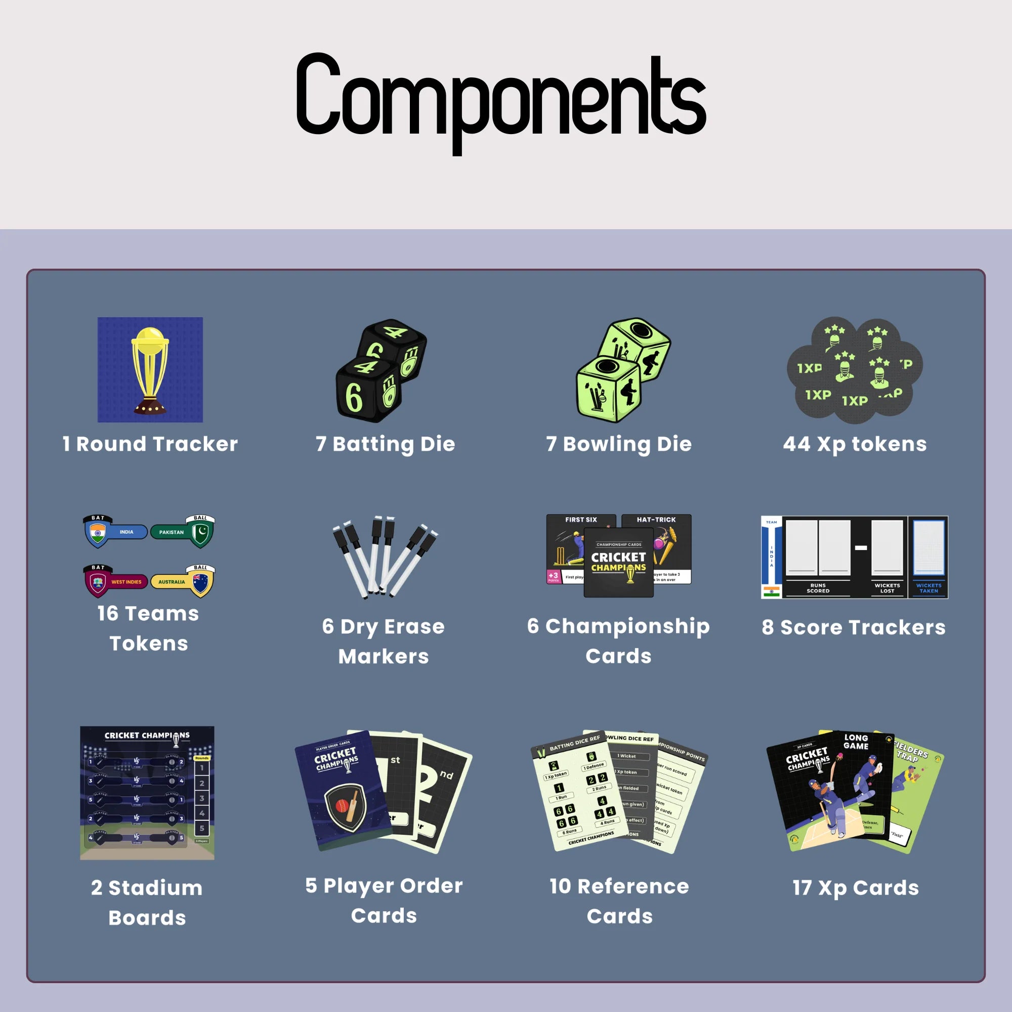 It's a light strategy game with a touch of luck. Players take on the role of one of eight cricket teams competing in a championship. In each round, players bat and bowl one over using six dice. As the game progresses, players gain experience, allowing them to enhance their skills. The game lasts for five rounds (45-60 minutes) and offers four different ways to earn winning points.