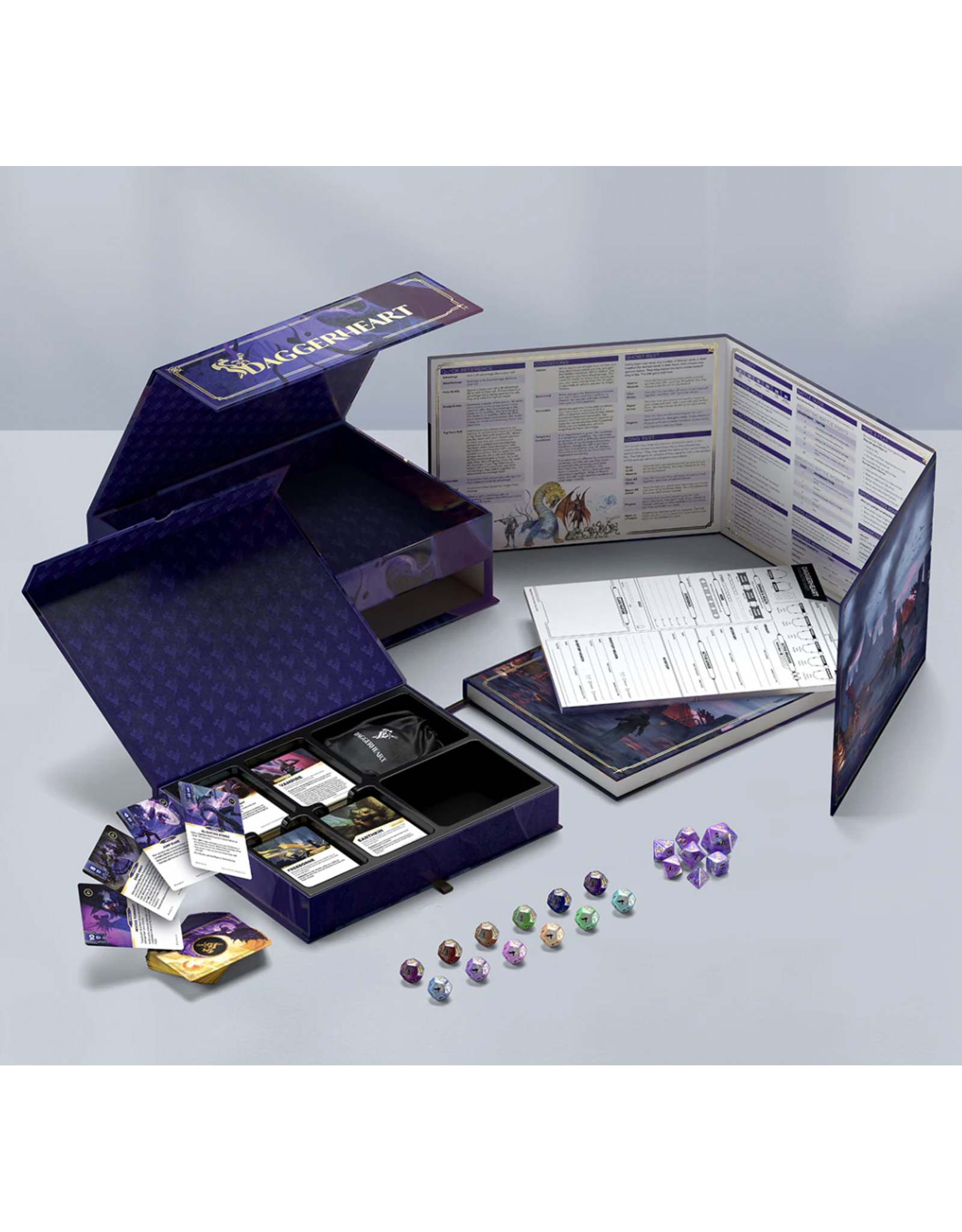 This is the DELUXE EDITION of Daggerheart: Hope & Fear, which contains exquisite extras and unique art! The deluxe edition is a stunning box set containing all the material found in the standard edition PLUS unique accessories and enhancements, including alternate cover art, a new GM screen complete with rhombic fear tokens that slide onto the top of the screen, a full set of polyhedral dice, an oversized d20 for the GM, and a set of 10 rhombic d12s for players to use as Hope & Fear dice!