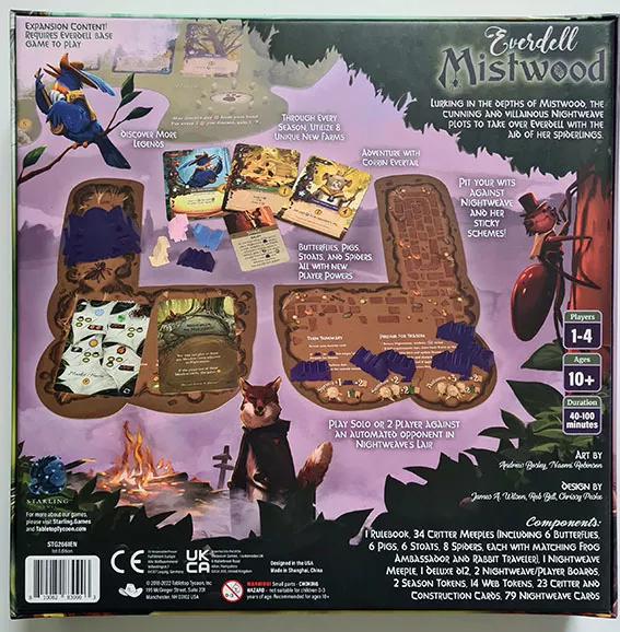 Lurking in the depths of Mistwood, the cunning and villainous Nightweave plots to take over Everdell with the aid of her spiderlings. Pit your wits against Nightweave and her sticky schemes in solo or two-player games, and recruit heroes of yore from the More Legends and Corrin Evertail expansion packs as well as transform your farms with our new Through Every Season expansion pack!
