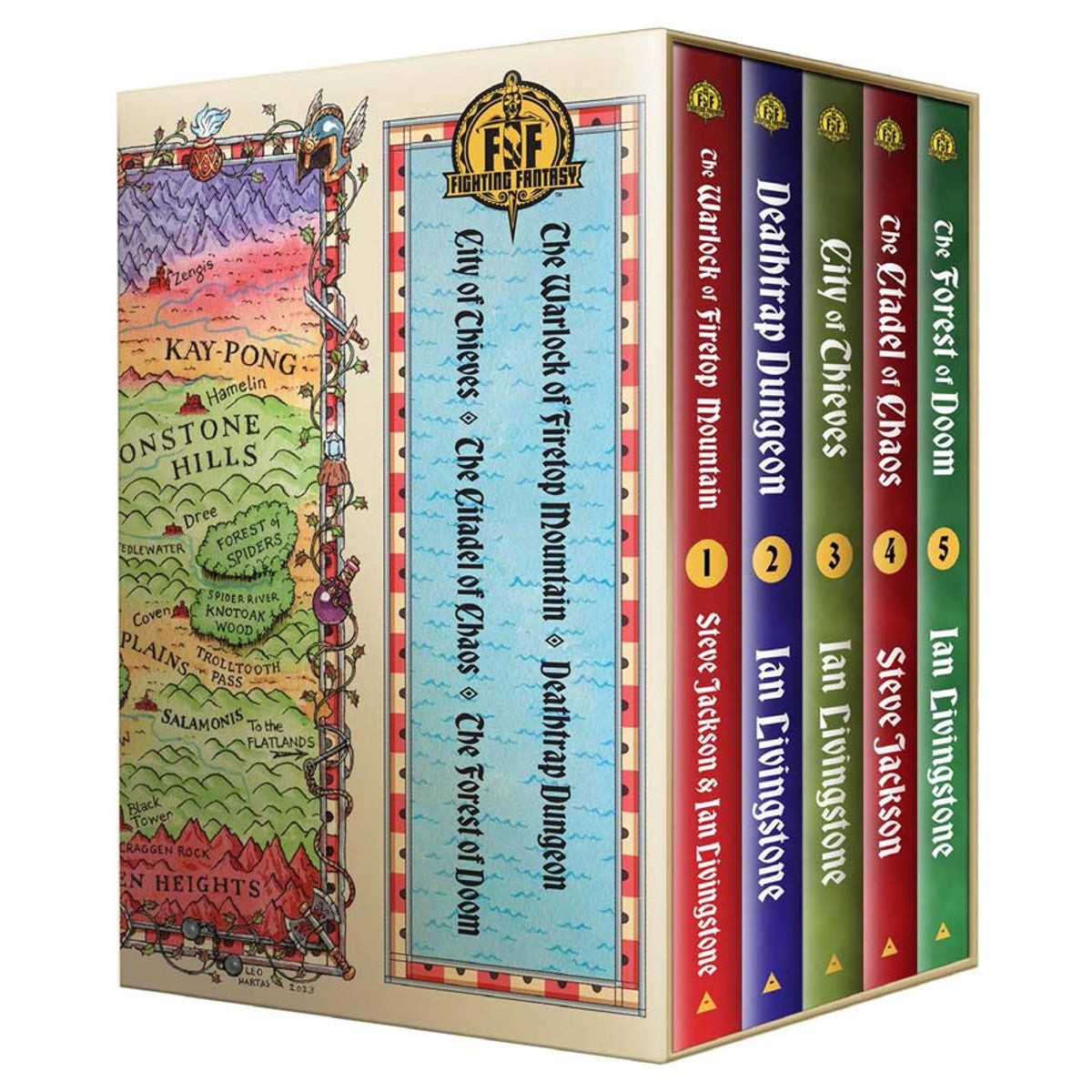 This first set includes five books: The Warlock of Firetop Mountain, Deathtrap Dungeon, City of Thieves, The Citadel of Chaos, and The Forest of Doom, as well as a full-color, custom-designed