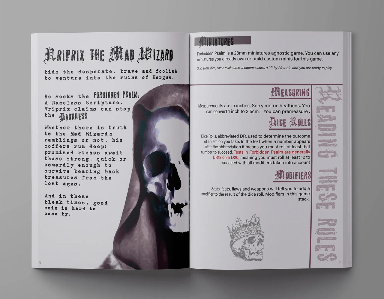 In Forbidden Psalmyou will recruit a warband of 5 greedy souls to undertake Vriprix the Mad Wizards’ bidding. But the Mad Wizard hasn’t just bet on you. You will face rivals before you will seen any of his coin. Hunt ravenous monsters and unearth dangerous relics as you search for the Psalm itself....maybe even help the Mad Wizard locate his misplaced socks.