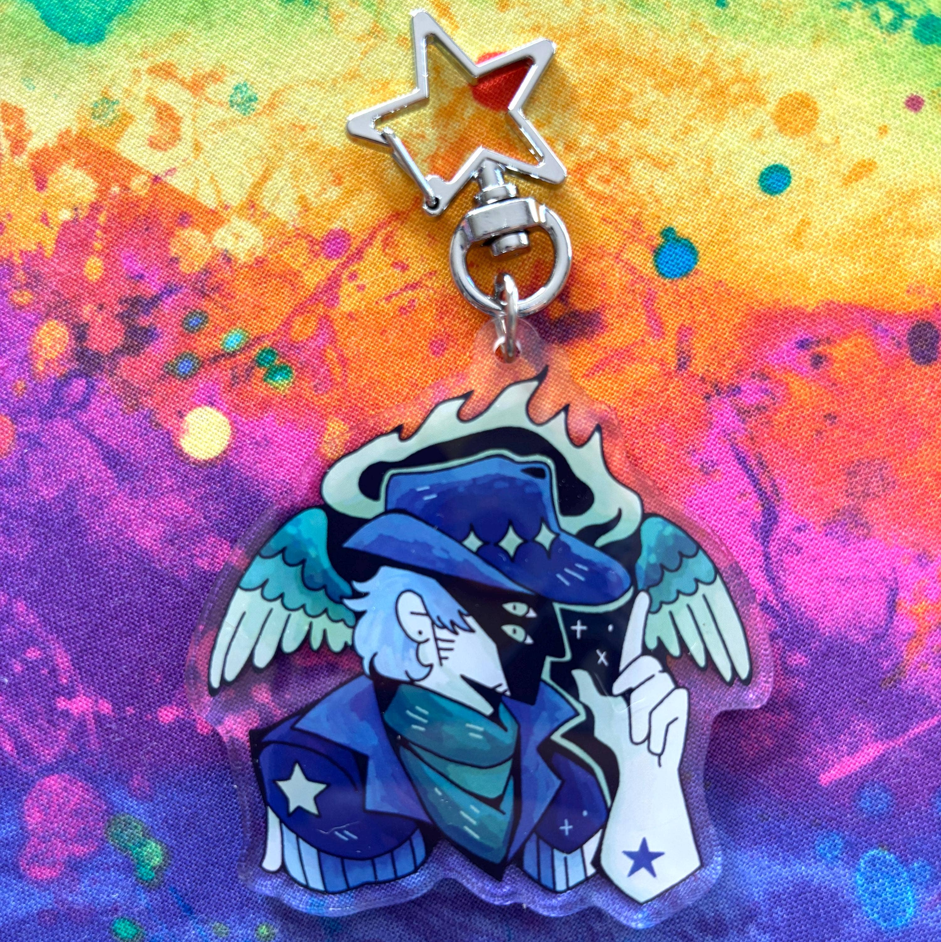This acrylic keychain is 2.5 inches (6.3 cm) on the longest side, double-sided with the same print on both sides; it has a silver star clasp.
