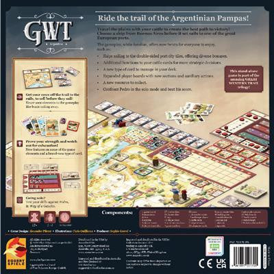 In Great Western Trail: Argentina, you own a vast estancia in Argentina at the end of the 19th century, and you will need to travel the plains of the Pampas with your cattle to deliver them to the main train station in Buenos Aires. Great Western Trail: Argentina features gameplay elements similar to Great Western Trail such as deck management, the rondel mechanism, and the ability to upgrade your player board, along with twists on these elements and new features.