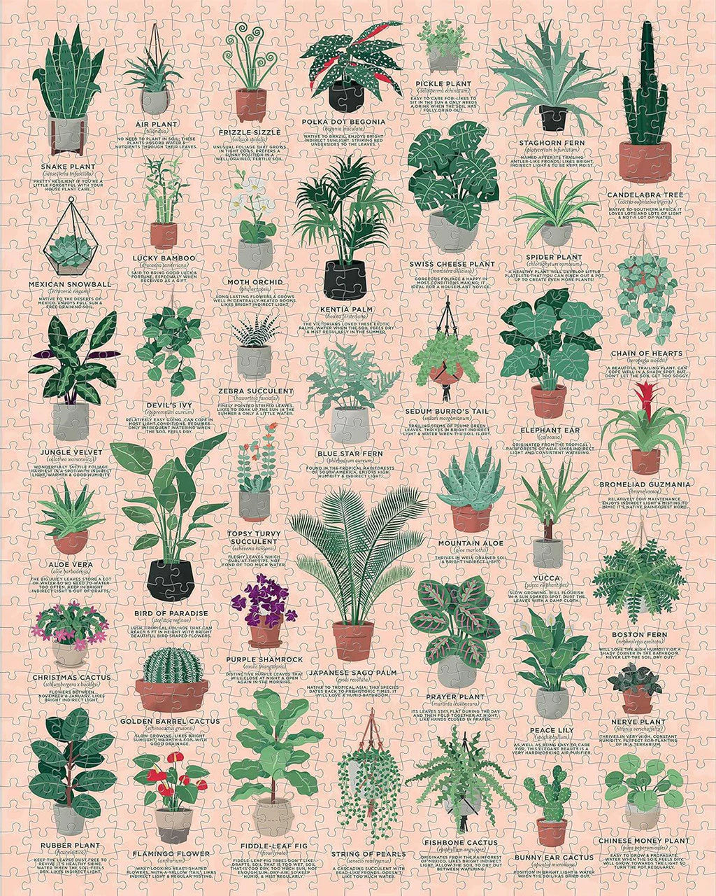 - LEARN ABOUT HOUSE PLANTS – From a Peace Lily to a Bird of Paradise, to a Swiss Cheese Plant and a Zebra Succulent and many more, this beautiful, hand-illustrated plant jigsaw puzzle features over 30 house plants and interesting facts and care instructions for them. It’s fun for the whole family!