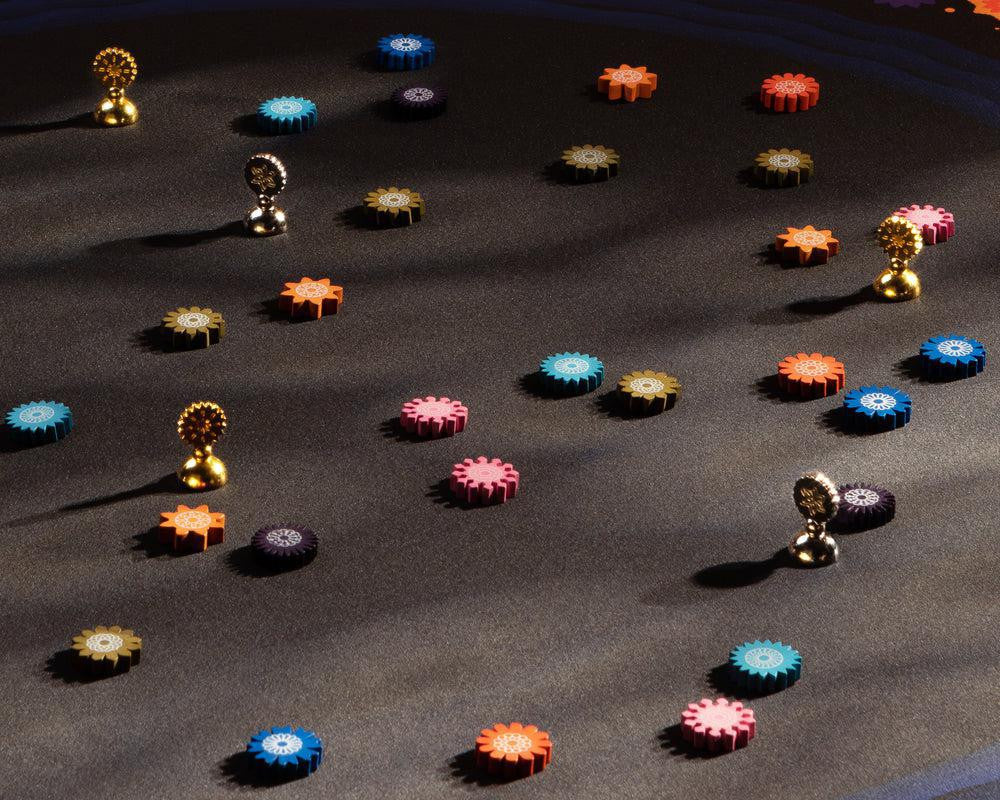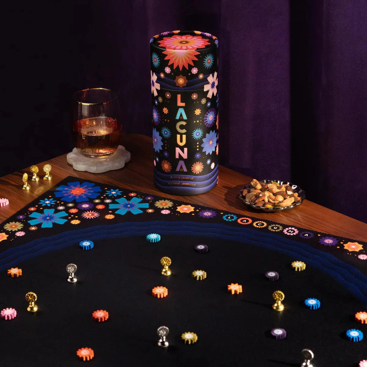 Lacuna is a game for 2 players about collecting flowers on a pond at night. It takes seconds to set up and plays entirely on a cloth mat. The rules are simple: draw an imaginary line between 2 flowers, place a pawn, and collect both flowers.