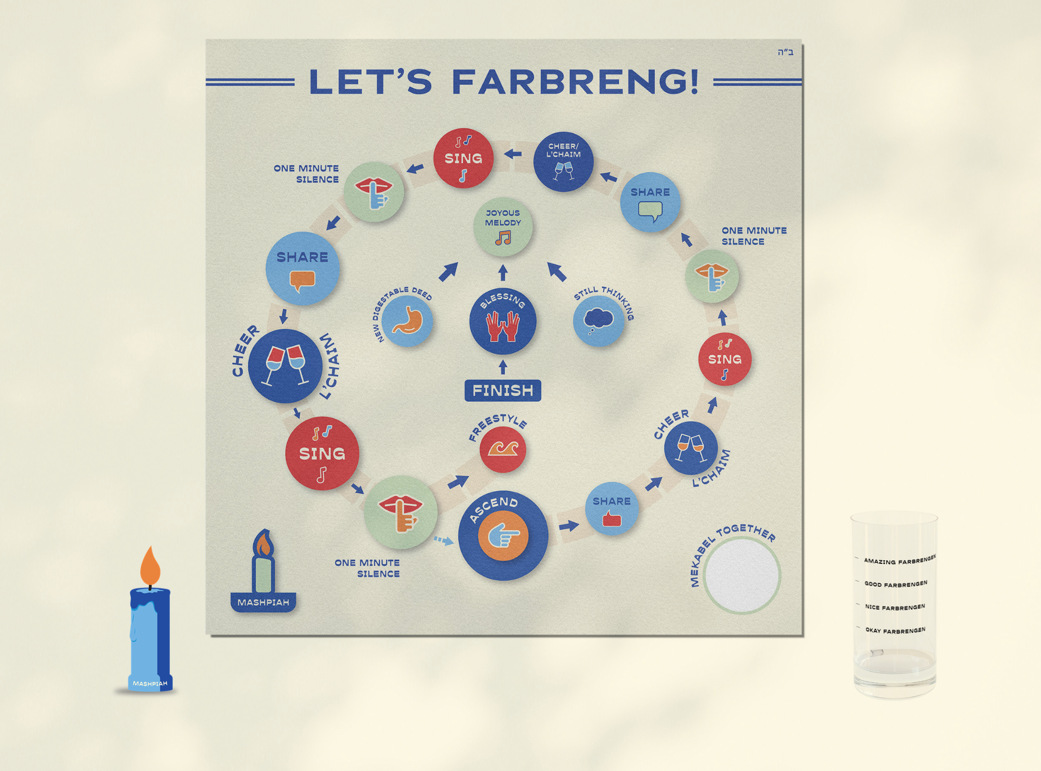 How to Play: Move around the board and land on spaces that invite you to share, sing, cheer, and reflect. The custom dice keep things exciting with unexpected prompts that make each round unique. Fill the Farbrengen cup with Mekabel pieces and unite in a joyful song when the game ends, leaving everyone uplifted and connected.