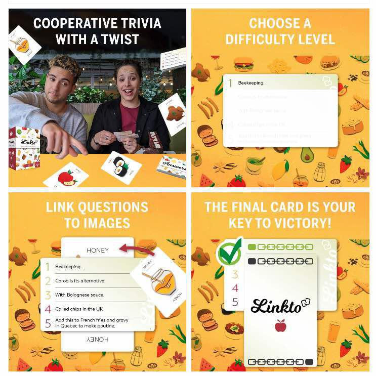 Linkto is a co-operative trivia game in which players team up to find the key amongst the 50 cards that feature unique art. It offers five levels of difficulty in the game as well as a competitive mode for those who want it.