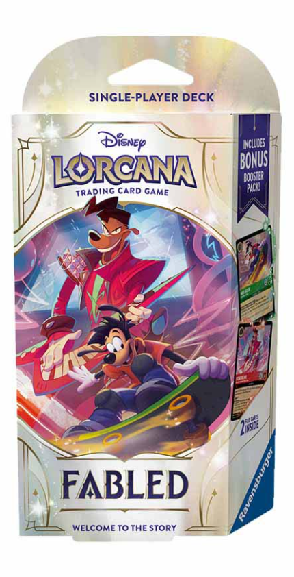 Two single-player decks are available for the Disney Lorcana TCG set Fabled. Each prebuilt deck has 60 cards and features cards from two inks, each with distinct play styles. The two ink combinations are Emerald & Ruby and Amber & Sapphire.