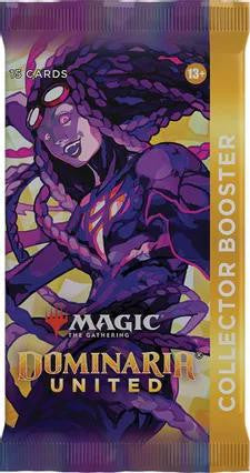The Dominaria United Collector Booster Box contains 12 Dominaria United Collector Boosters and 1 Traditional Foil Box Topper card.