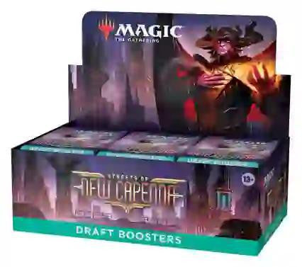The Streets of New Capenna Draft Booster Box contains 36 Streets of New Capenna Draft Boosters and 1 traditional foil box topper card. Draft Boosters are specifically designed for the best Magic: The Gathering booster draft play experience. Each pack contains 15 Magic cards and 1 token, ad card, or counter punchout card, with a combination of 1 card of rarity Rare or higher and 3 Uncommon, 10 Common, and 1 Land cards. A traditional foil card of any rarity replaces a Common in 33% of Streets of New Capenna Draft Boosters. Traditional foil Borderless Mythic Planeswalker in <1% of boosters.