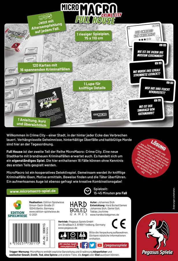 Crimes have taken place all over the city, and you want to figure out exactly what's happened, so you'll need to look closely at the giant city map (75 x 110 cm) to find all the hidden information and trace the trails of those who had it in for their foes.