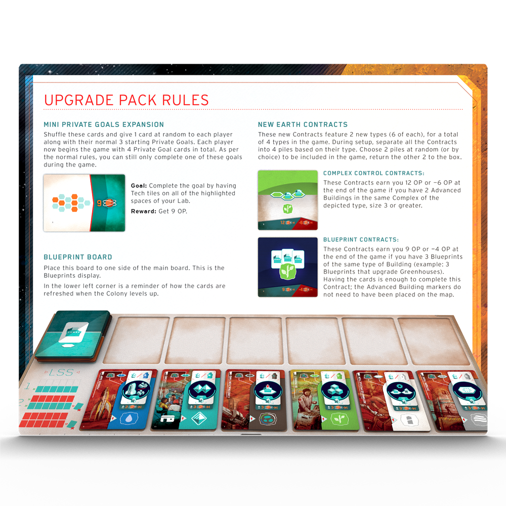 All buildings on Mars have a dependency on each other and some are required for the colony to grow. Building shelters for Colonists to live in requires oxygen; generating oxygen requires plants; growing plants requires water; extracting water from ice requires power; generating power requires mining minerals; and mining minerals requires Colonists. Upgrading the colony’s ability to provide each of these resources is vital. As the colony grows, more shelters are needed so that the Colonists can survive the inhospitable conditions on Mars.