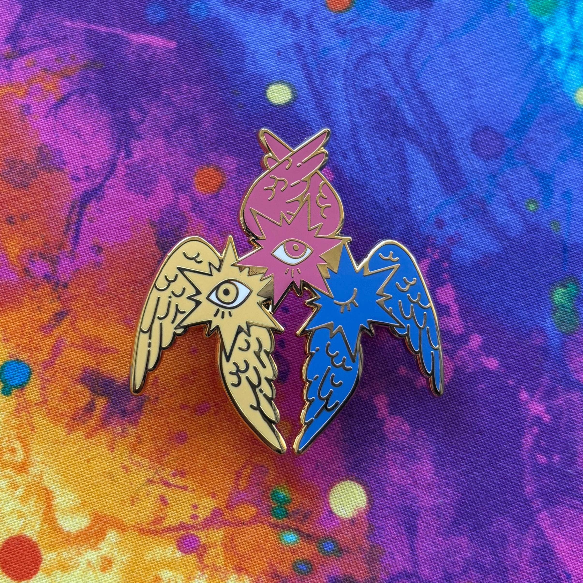 This pin is 1.9 inches long with gold plating. It has hard enamel, rubber backings, and two pin posts.