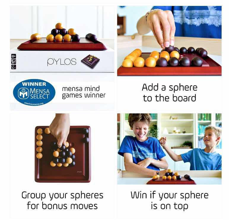 Pylos combines aesthetic design with simple but rich and tactical gameplay. There is a satisfying feeling in manipulating the wooden spheres, planning several moves ahead, and ultimately being the one to place the last ball on top of the pyramid!