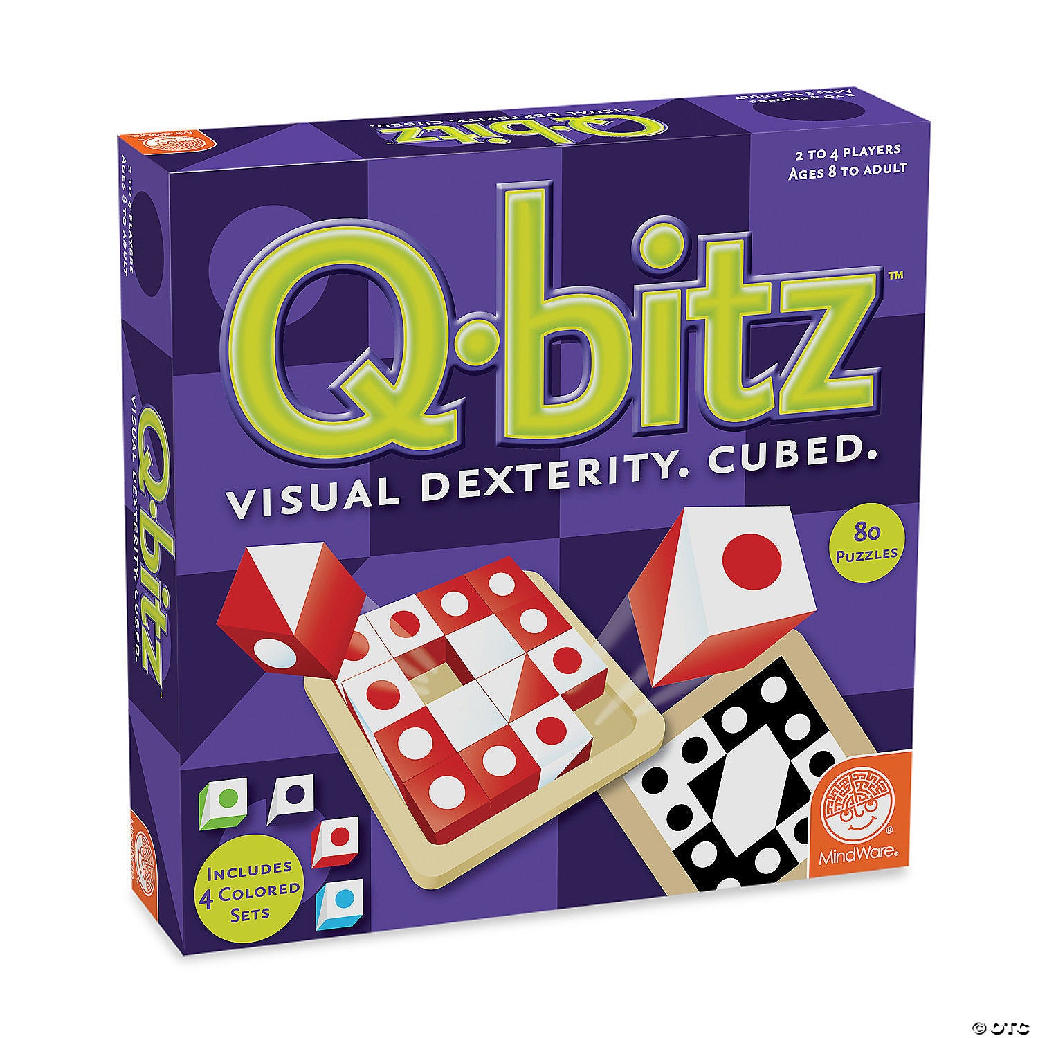 Say goodbye to boredom and challenge your mind and each other with this family-fun puzzle game! Q-bitz™ offers three types of visual challenges, making it the perfect game for multiple playing styles. Round one of this popular MindWare game is all about speed as players race to manipulate their cubes to copy the pattern on the Q-bitz™ pattern card. In round two, players roll all of their cubes on the table like dice. Using the cubes as rolled (face up), players place as many cubes as possible in the tray to recreate the pattern shown on the card. Players race to re-roll all remaining unusable cubes until they roll the shapes that are needed to complete the pattern. Round three really tests brain power: players study the pattern card for ten seconds, flip it face down and then re-create the pattern from memory!• Teaches symmetry, visual dexterity and friendly competition • Stimulates the brain to use spatial reasoning and memory skills• Offers 3 ways to play and design cards that vary in difficulty, making it an exciting fast-paced game for all ages• Includes 80 Q-bitz™ cards, 4 wooden trays and 4 sets of 16 cubes. For 2 to 4 players.