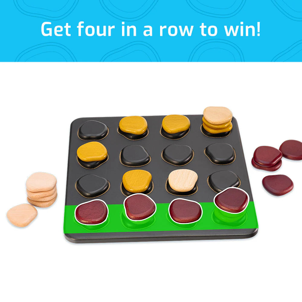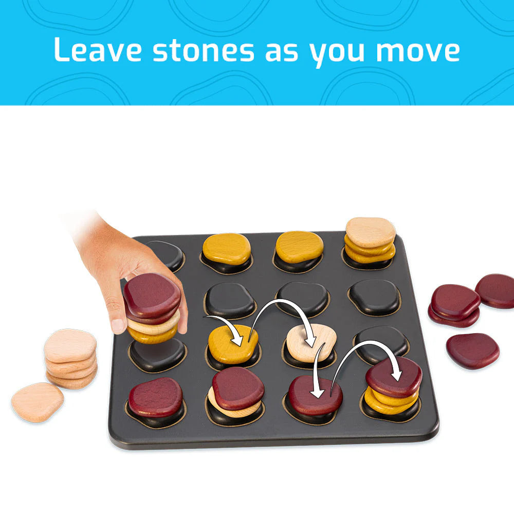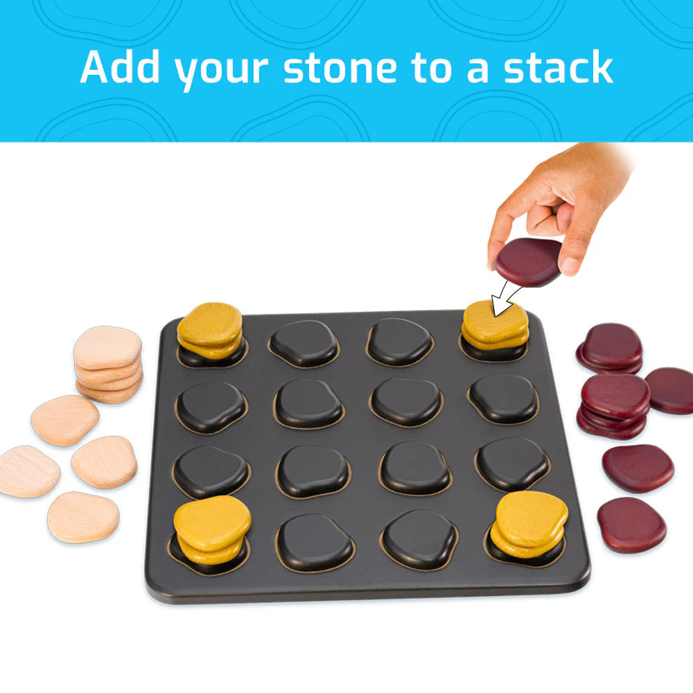 Each player takes 8 stones in their color. The third color is neutral and is placed in the 4 corners of the board. On your turn, add a stone on top of any pile and move it. When moving a pile, you must leave a stone on each space you cross. The first player to get 4 of their stones in a row, looking at the board from above, wins the game.