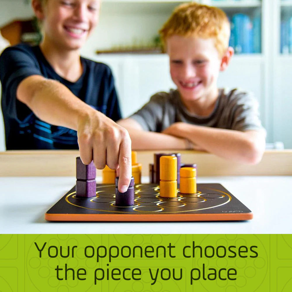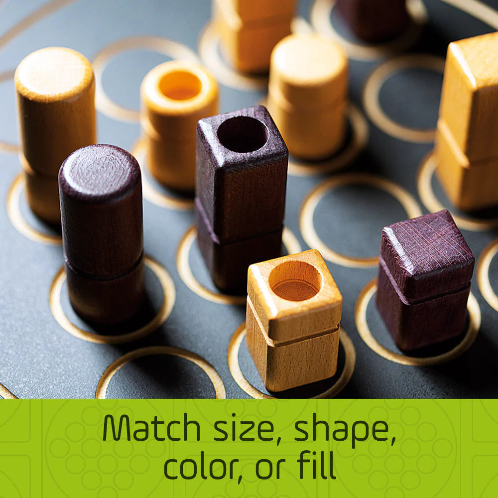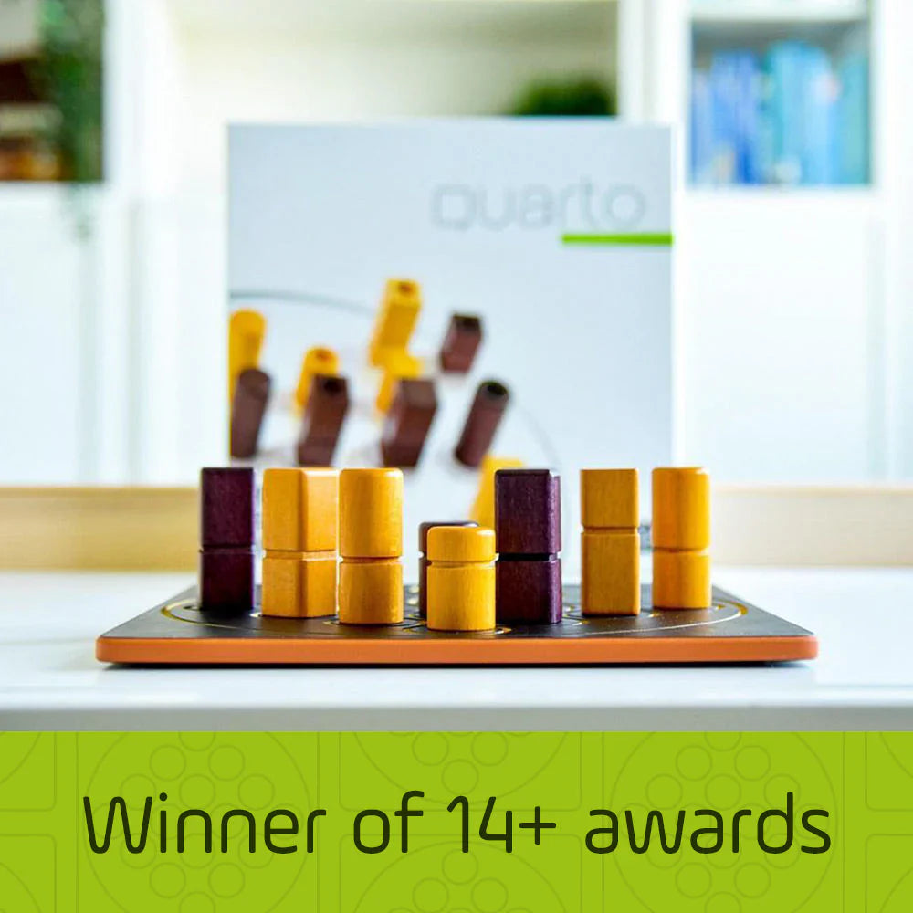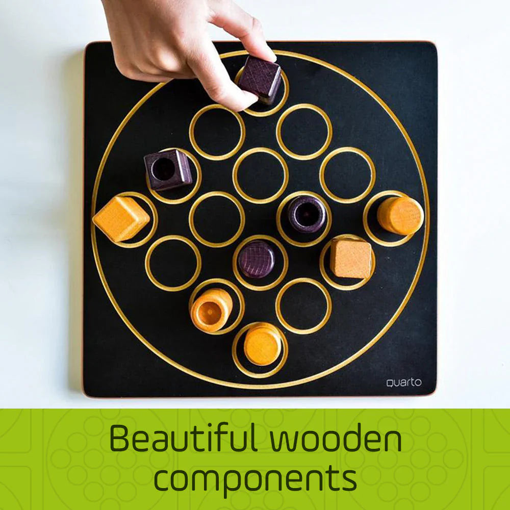 Quarto has a 4×4 board and 16 pieces. Each piece has four dichotomous attributes — color, height, shape, and consistency — so each piece is either black or white, tall or short, square or round, and hollow or solid. The object is to place the fourth piece in a row in which all four pieces have at least one attribute in common. The twist is that your opponent gets to choose the piece you place on the board each turn.