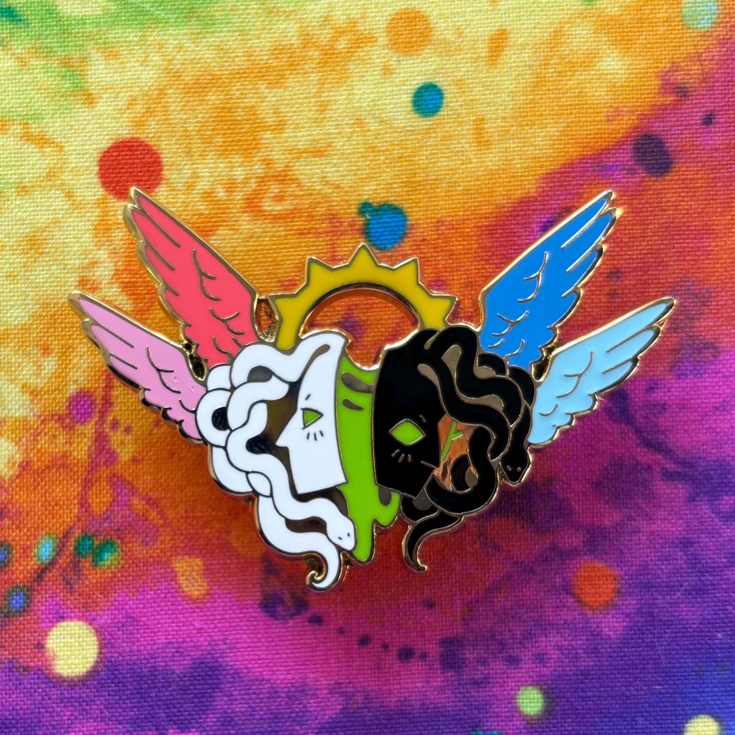 This pin is 2.3 inches wide with gold plating. It has hard enamel and two pin posts with rubber backings.