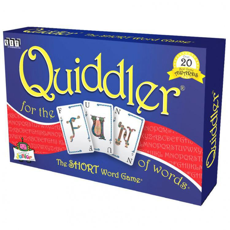 Quiddler Set Enterprise Quiddler, is a beautiful word game with naturally smooth gameplay that plays fast. These are essentials for a successful game that few word games have. Using special cards, Quiddler draws on one's ability to combine letters into words. Players must combine their entire hand into words trying to use the highest point value letters. Quiddler challenges you to do this first with three cards (round one), then with four, on up to ten cards in the last round. A bonus is given for both the longest word, and the most words made by a player in each round. The average game takes 20-40 minutes.Although it may appear that the person who knows the most words would consistently win, this is not the case when playing Quiddler. There is a visual perception aspect that draws on combining the cards with the highest points into the words rather than the first words a player recognizes. There is also an element of strategy. Players who win often don't go out at their first opportunity on the other hand, sometimes they go out as soon as possible. Their actions are aimed at increasing their odds of getting either the long-word or the most-words bonus.Ages 8 to Adult1-8 Players OBJECT: To obtain the highest number of points by combining the cards in your hand into words. The words must use two or morecards.THE DECK: The game consists of a 118 card deck. It contains cards from A to Z with special double-letter cards -- QU, IN, ER, TH and CL. Each card has a point value.
