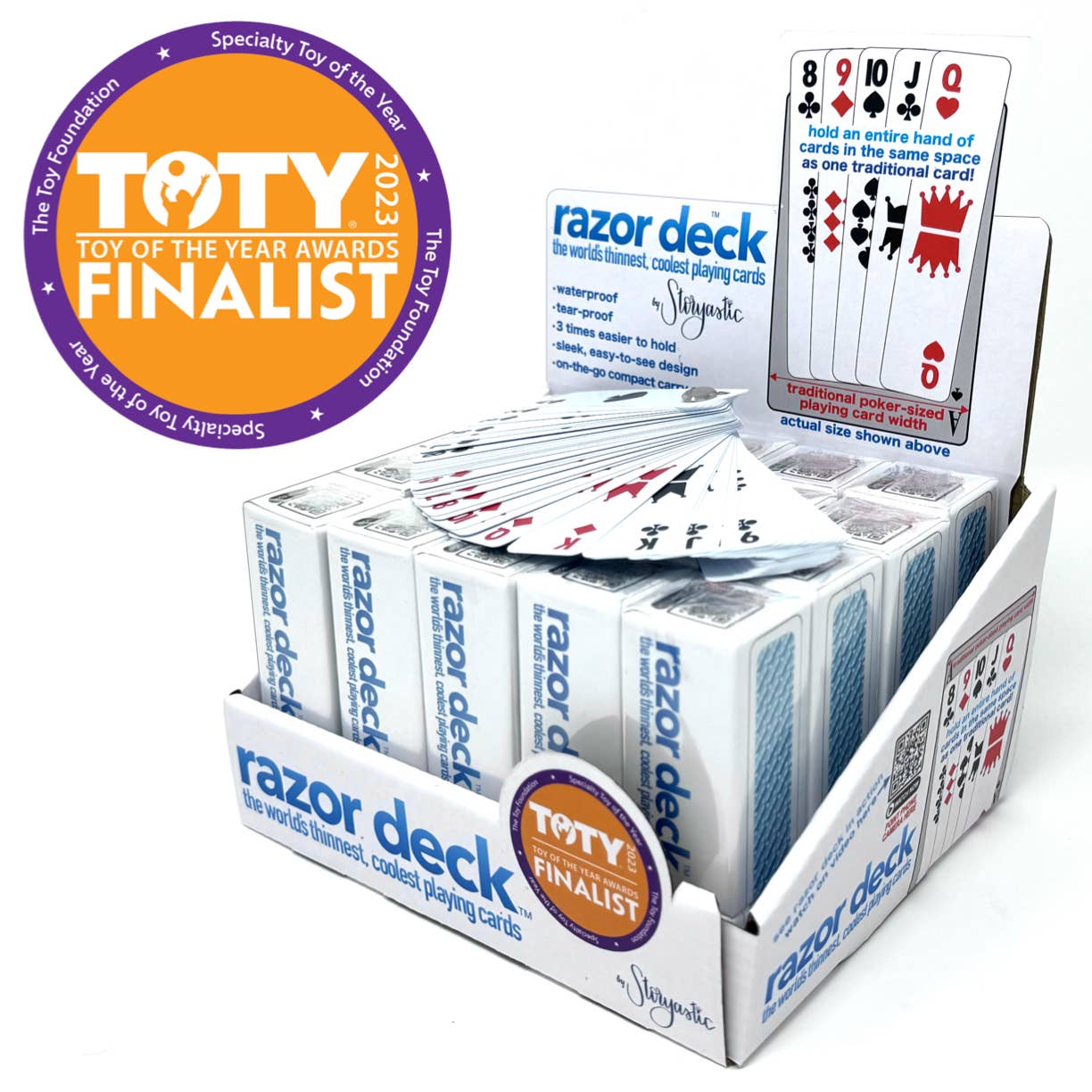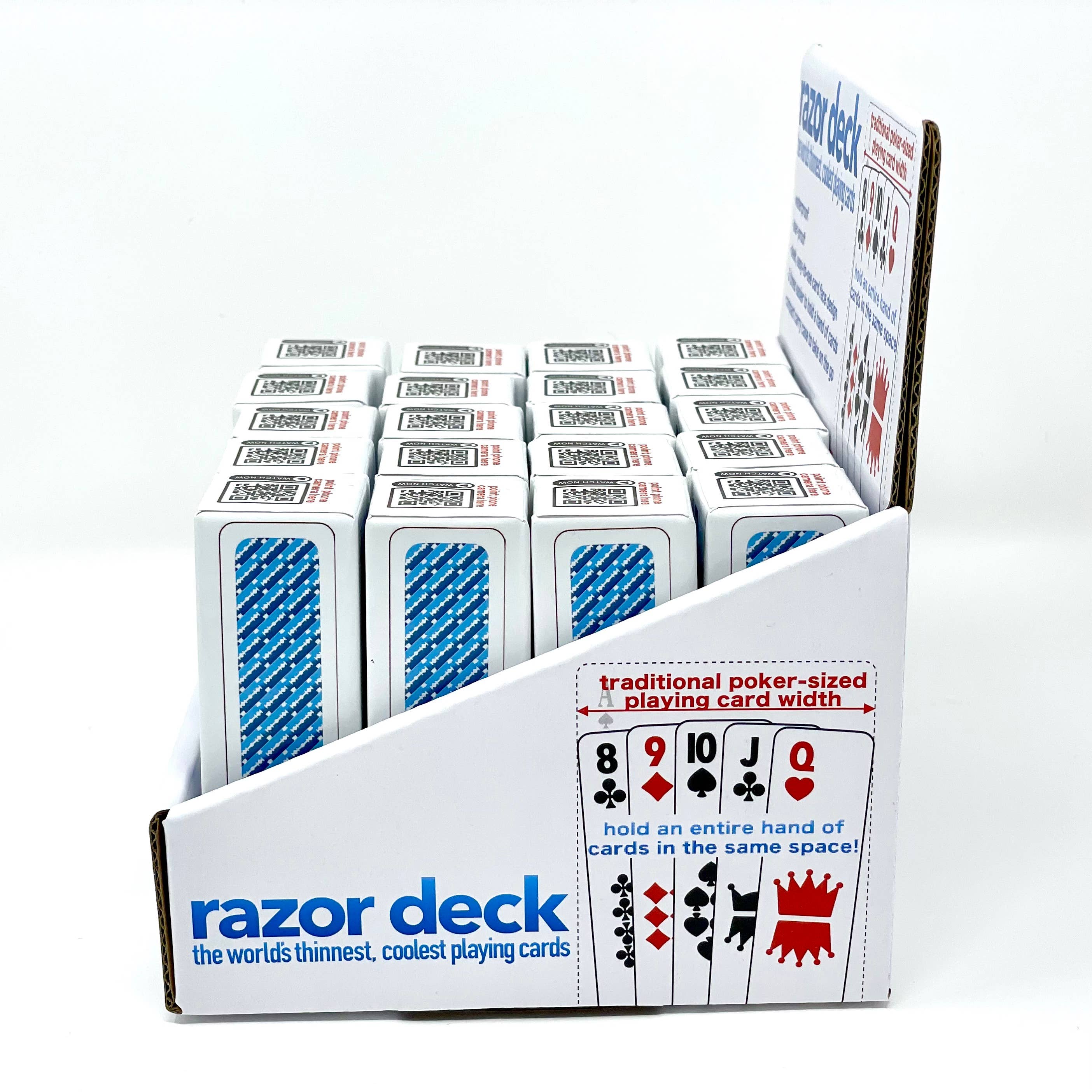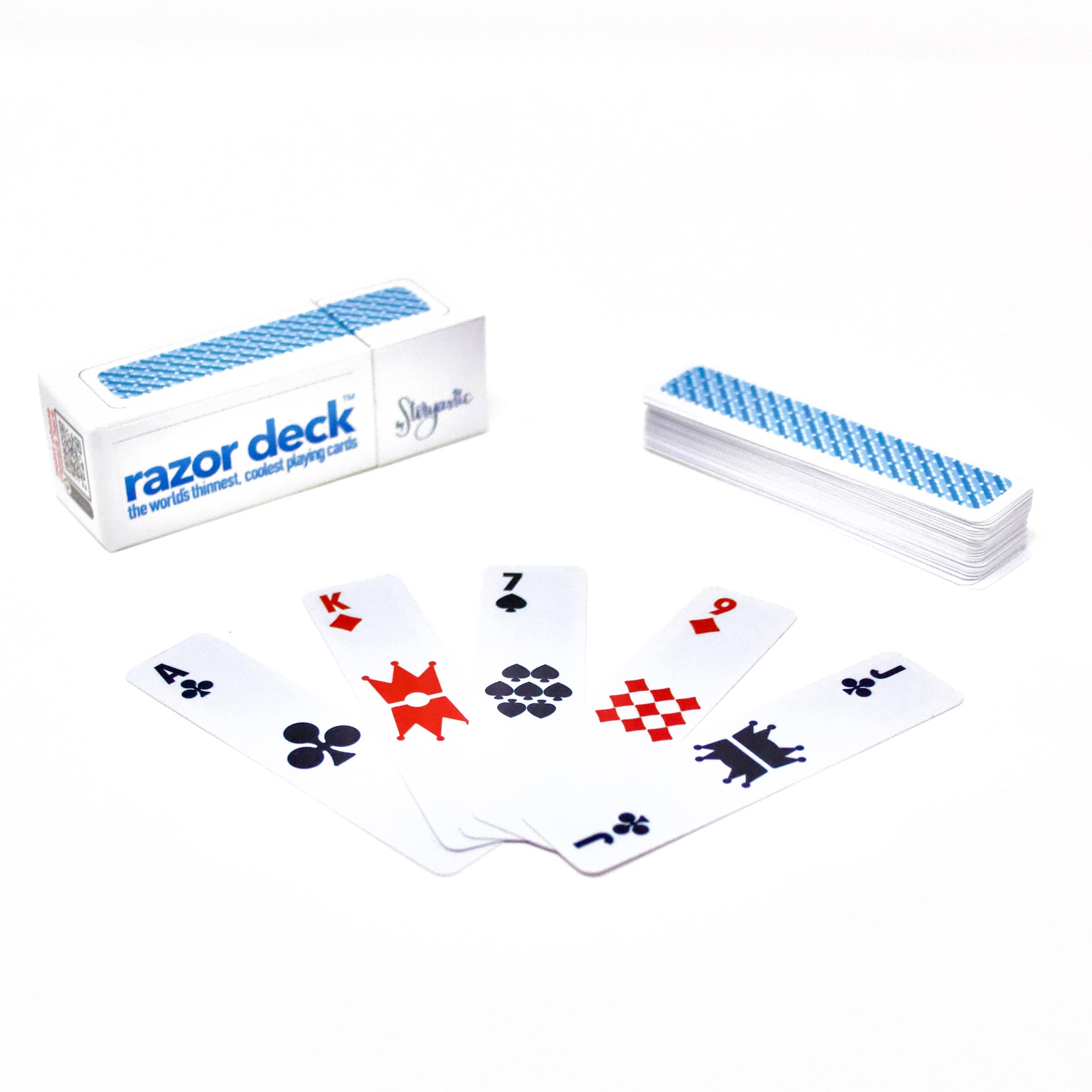 RAZOR DECK are high-profile playing cards with a low profile. They're 1/3 the width of poker-sized cards. Card games are played with the edges of the cards, so why have all that wasted space?
