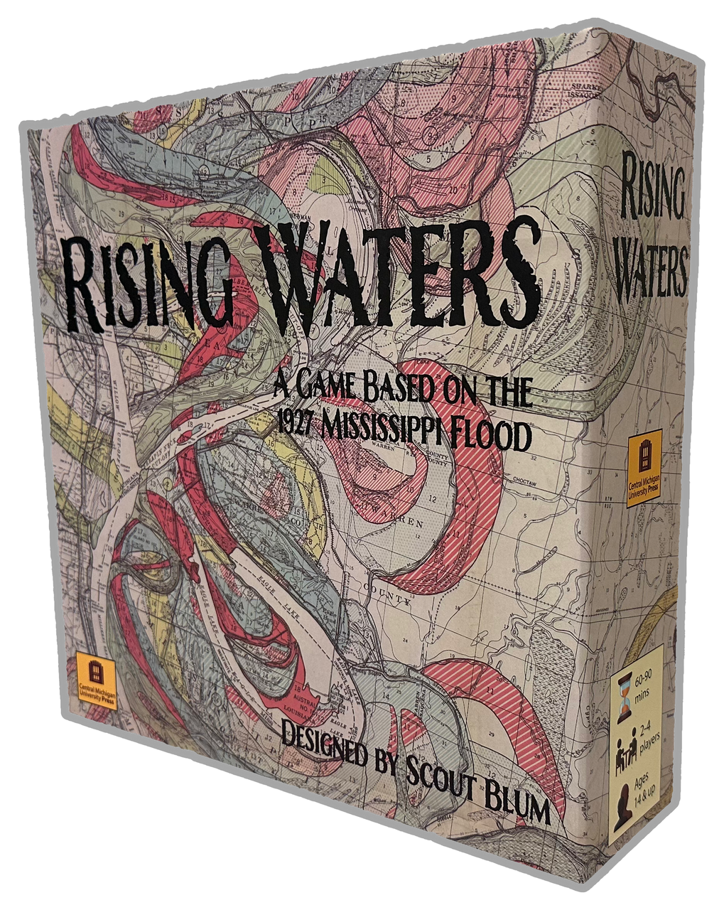 Rising Waters is played on a hex-based map of the Mississippi River and surrounding lands based on the area around Vicksburg, Mississippi. The game runs over a series of rounds representing different weeks during the flood, when players have opportunities to work cooperatively and individually to save their homes, families, and communities. During the flood, work together to keep your family and neighbors alive by minimizing losses during the flood. Players must also negotiate the arbitrary demands of white landowners.