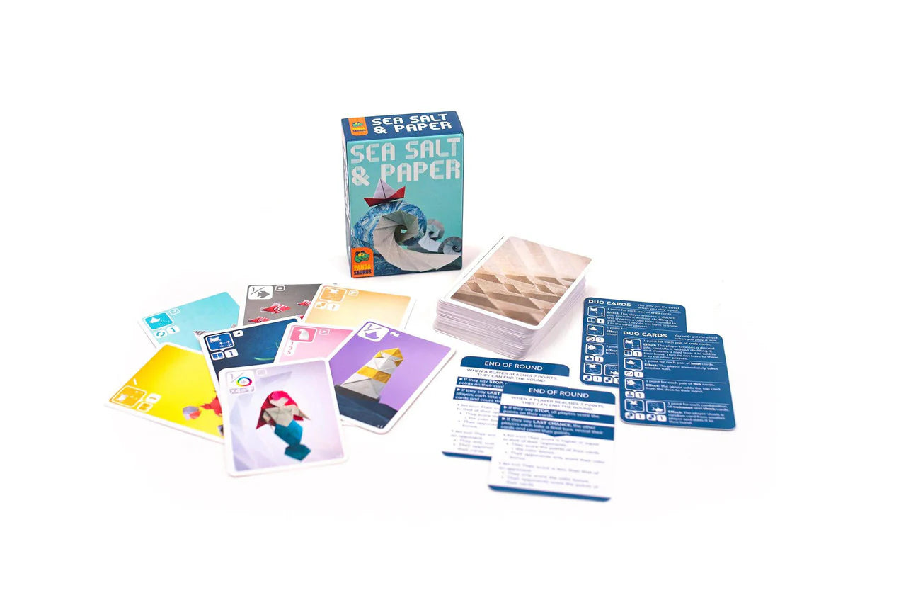 In Sea Salt & Paper players are trying to manage their hand and collect sets of cards. On your turn you may either draw 2 cards from the deck, keep 1, and discard the other face up, or take the topmost card of 1 discard pile. You may then play matching pairs from your hand to take special effects like stealing a card from your opponent or taking another turn.