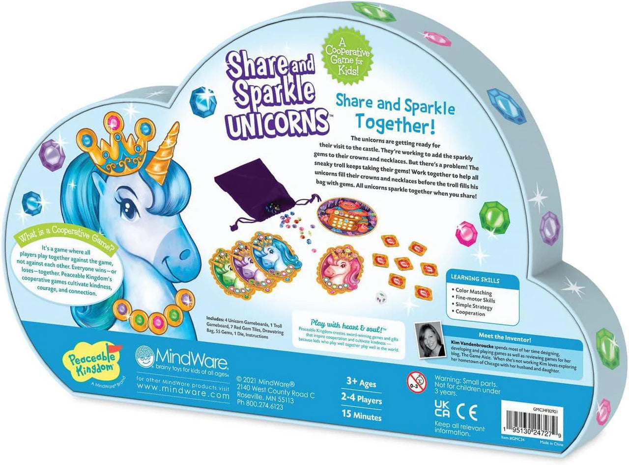 • Share and Sparkle Unicorns is a cooperative game that encourages players to work together to save their jewels.