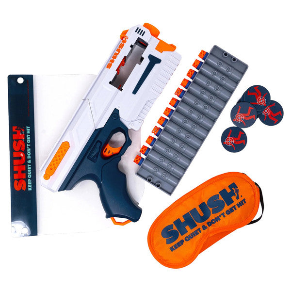 Includes 1 Shush Blaster, 12 foam bullets, 1 blindfold, 6 protective face shields, 28 tokens and 2 base pads! Just gather your friends, load the Blaster and get ready for some high-energy fun!