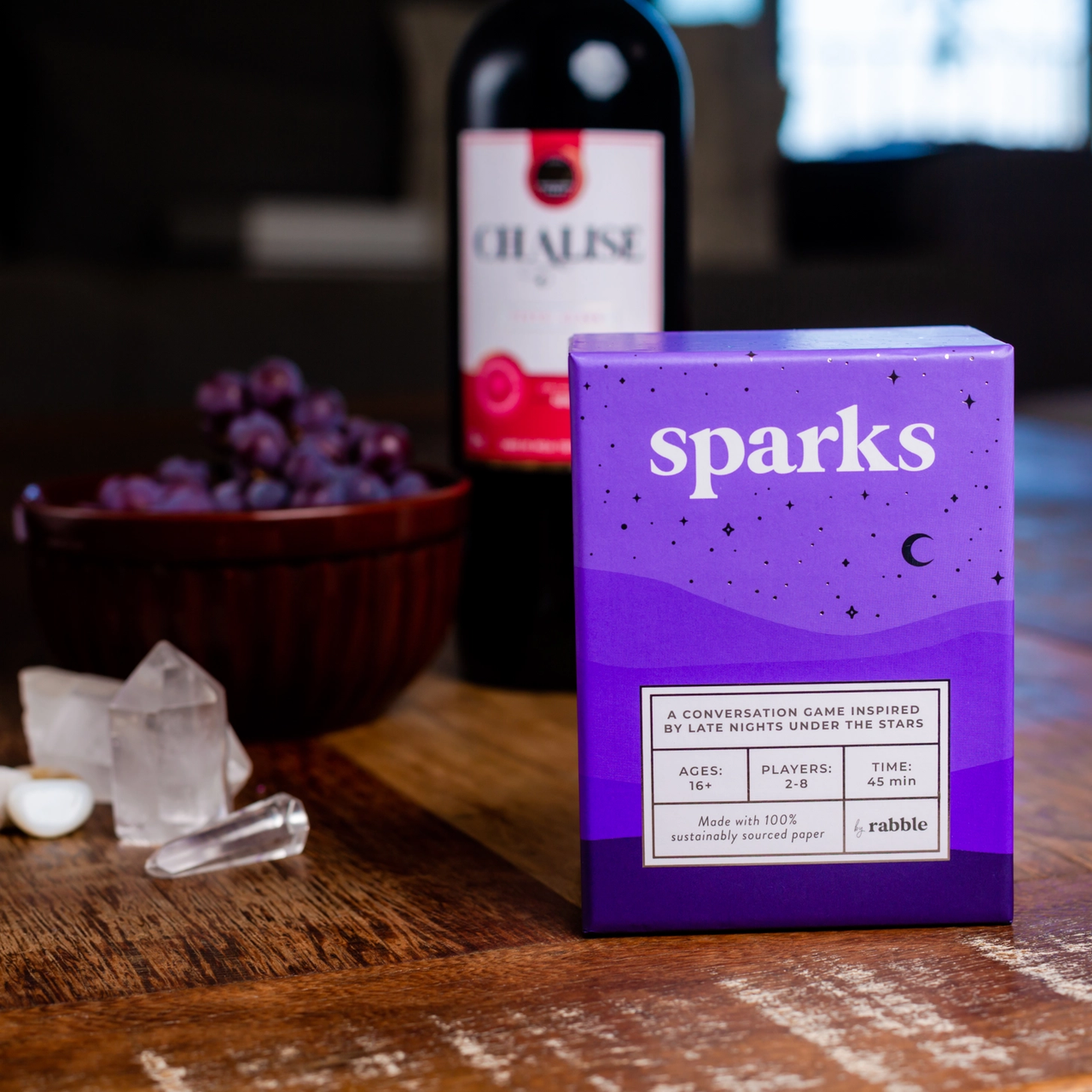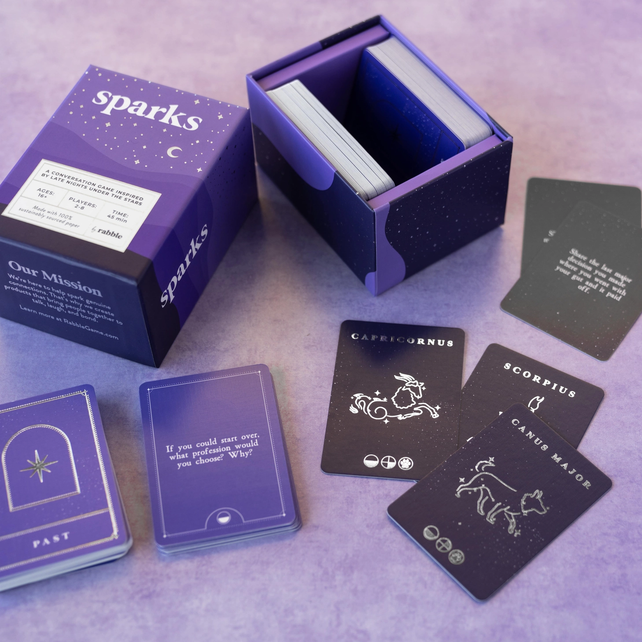 Sparks is inspired by the engaging, thought- provoking, and sometimes odd conversations that occur underneath a star-filled night sky. Sparks, a conversation card game, was created to recreate those moments no matter where you are and who you're with.