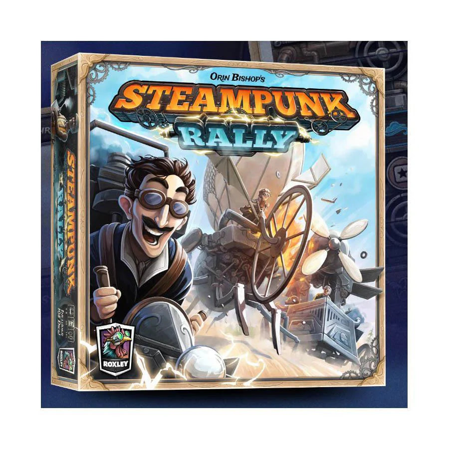 Steampunk Rally is a strategy game that incorporates steampunk as more than just a bit of chrome. Using a unique dice-placement mechanic, players take on the roles of famous inventors like Nikola Tesla and Marie Curie constructing fantastical contraptions that make use of steam, heat and electricity in an attempt to win a no-holds-barred race through the Swiss alps!